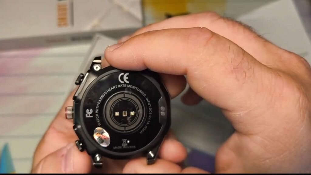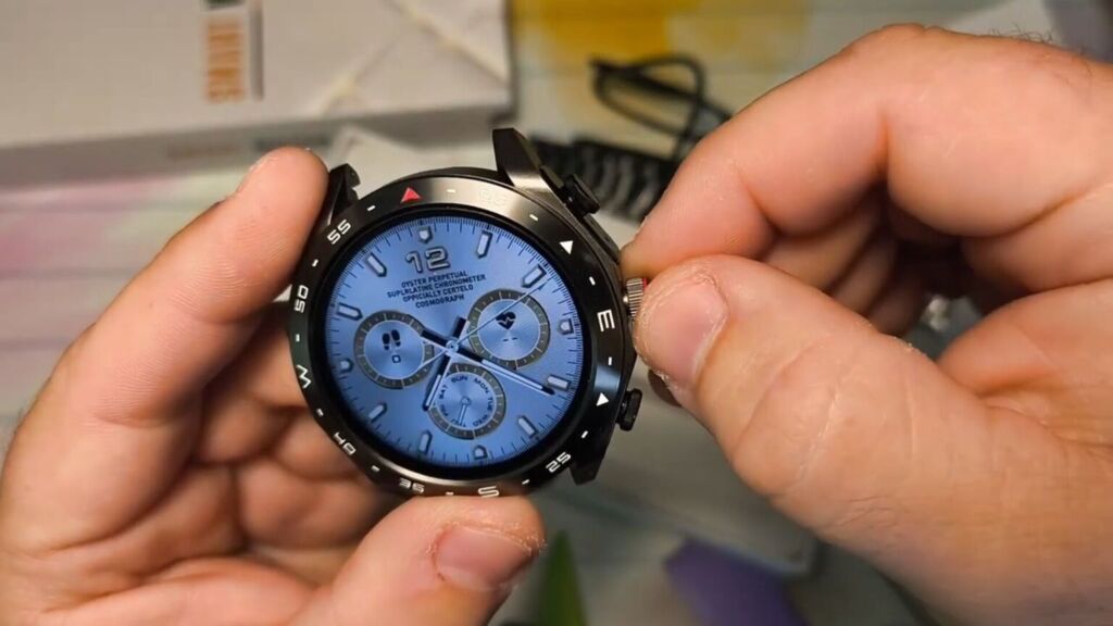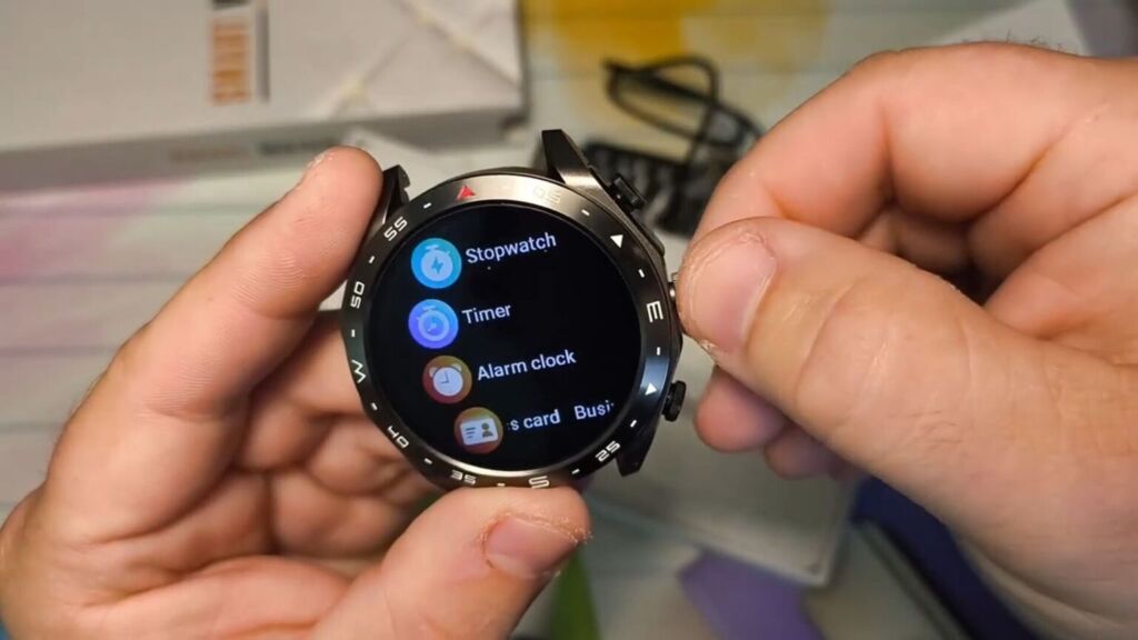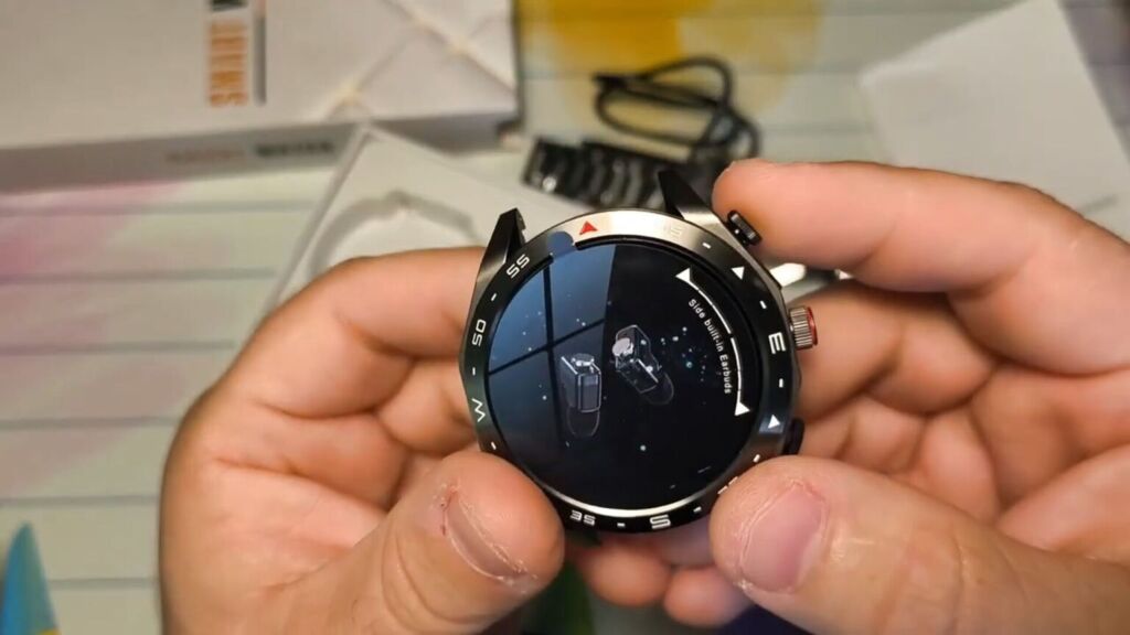 När vi tittar närmare på PAEAROFERO T95 lägger vi märke till en unik funktion hos denna smartklocka. Det som verkar vara två knappar, en övre och en nedre, placerade på höger sida av fodralet är i själva verket hörlurar. Ta bara bort dem, para ihop dem med din smartphone och njut av musik och samtal utan att behöva bära med dig en extra enhet. Den mittersta knappen, å andra sidan, är en sorts digital krona, som också ger feedback via vibration. Den här knappen låter dig komma åt menyn och bläddra igenom den genom att helt enkelt rotera den. Navigering inom menyerna är också möjlig via pekskärm.